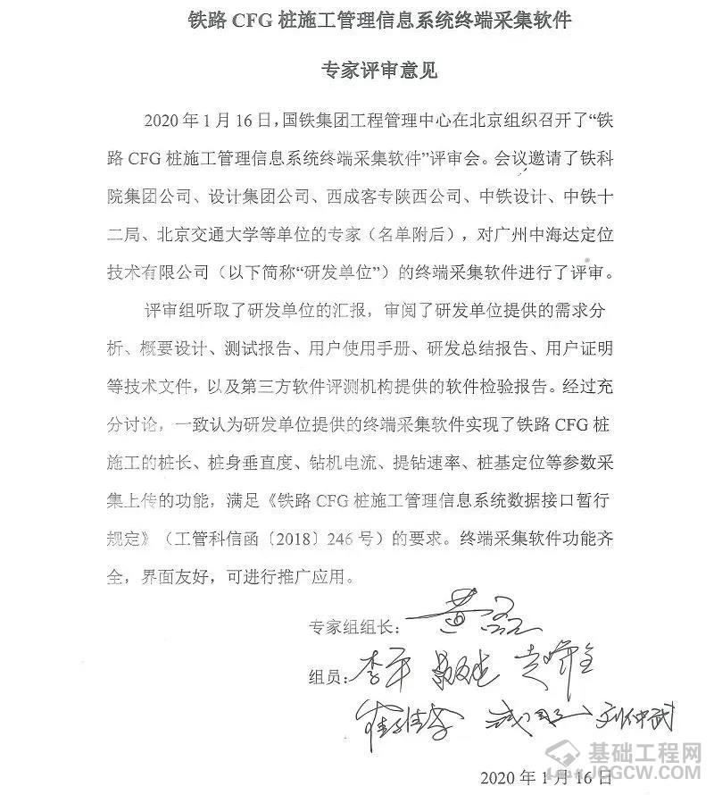 经讨论,一致认为“铁路CFG桩施工管理终端系统”实现了对铁路CFG桩施工过程中的实时定位引导,桩长、桩身垂直度、提/下钻速度、地层钻进电流等数据的实时采集、显示、分析、预警等功能,初步实现了铁路 CFG桩施工信息化,满足《地基处理桩基施工管理终端系统》(Q/CR-TKT-00 0045-2018)的要求。系统操作简便、采集数据准确,满足施工现场管理需求,可进行推广应用。