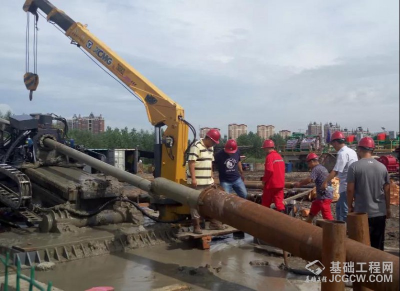 施工地层以粉质粘土和细砂土为主,部分地段含有中粗砂,工程使用两台徐工大吨位水平定向钻机对穿施工。