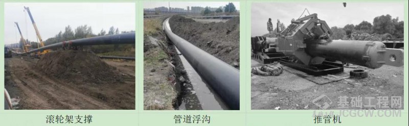 管线一次性回拖,采用浮沟加滚轮架支撑管道,减少地面摩擦阻力,使用推管机助力回拖。