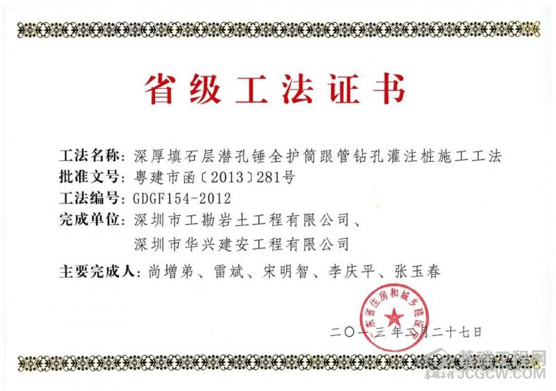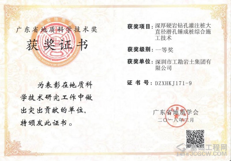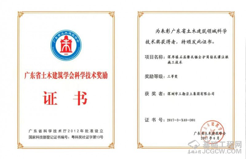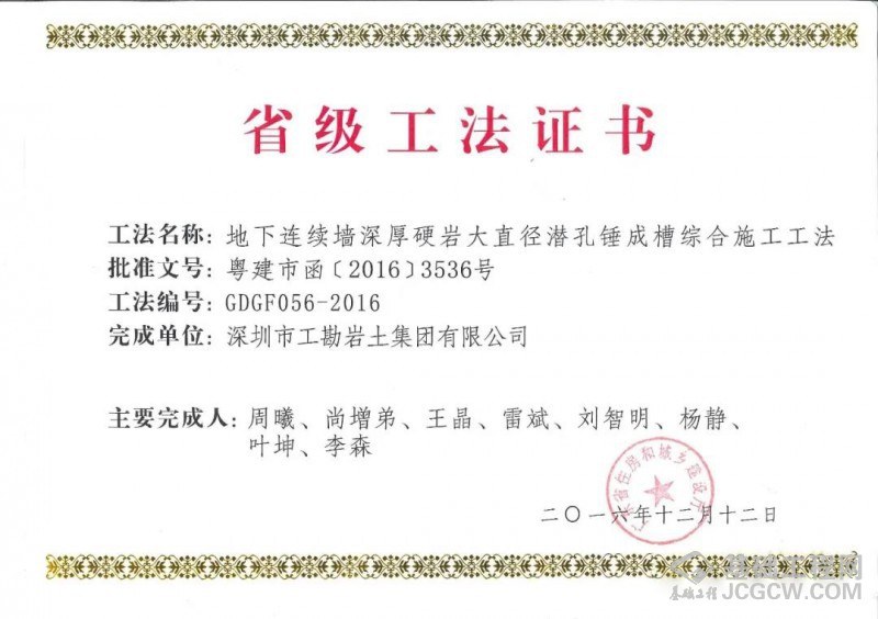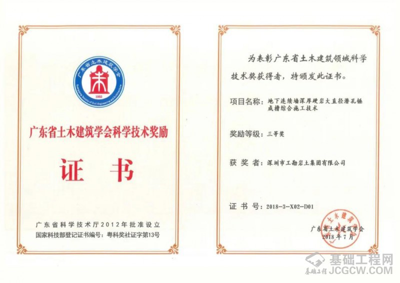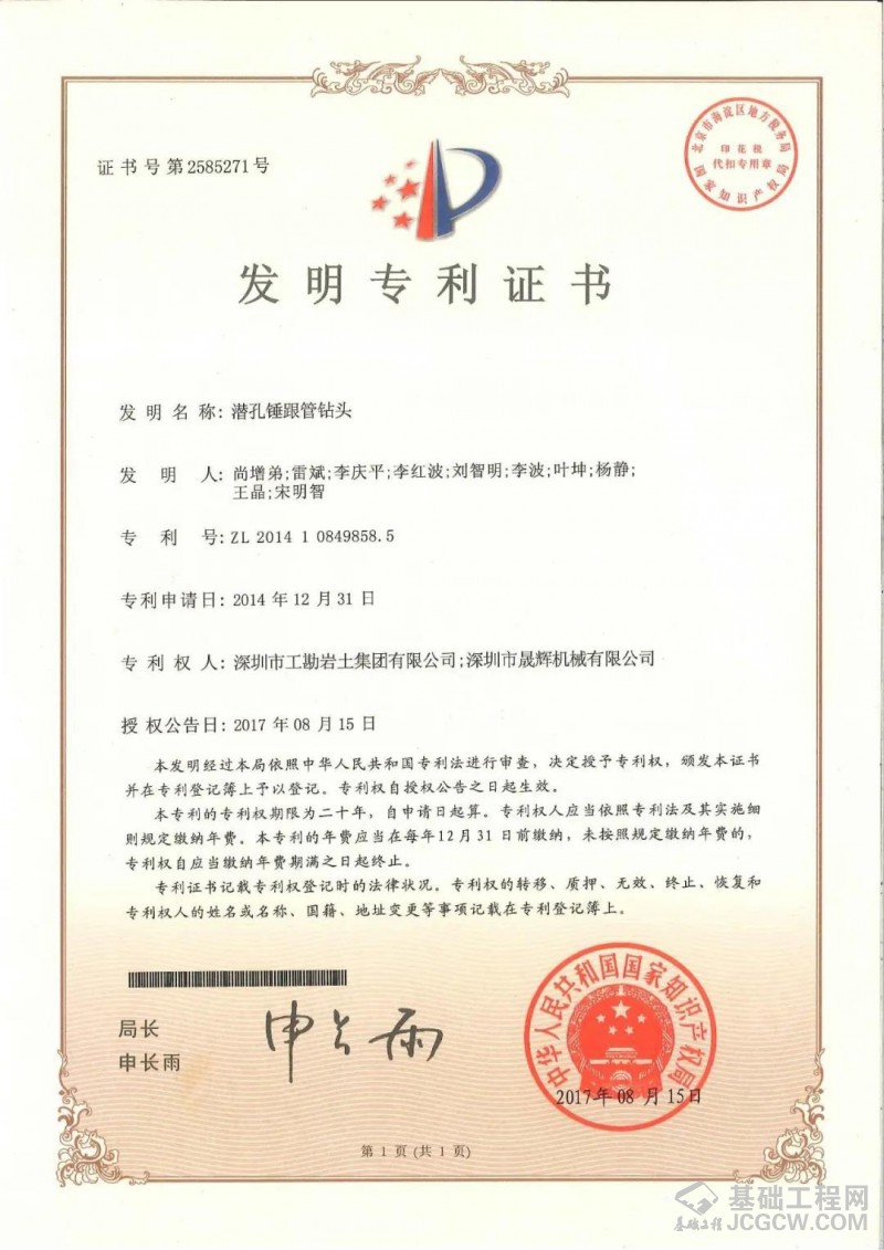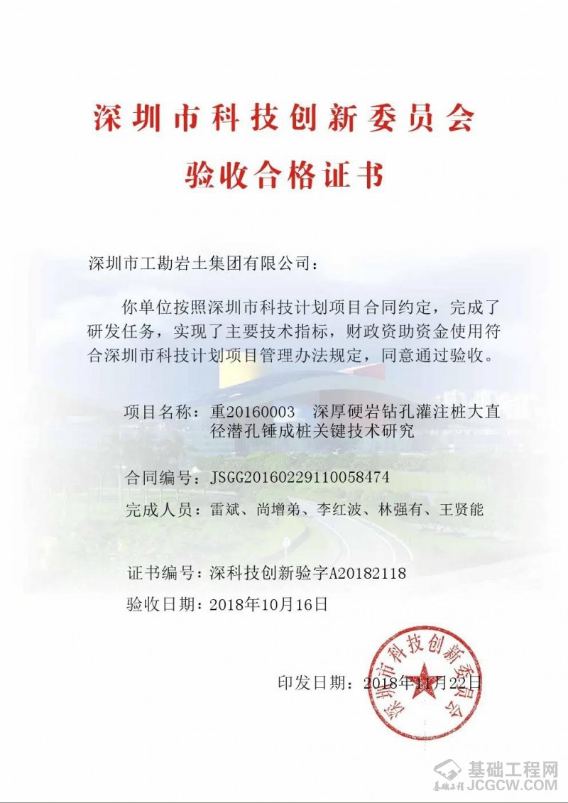 “雷斌创新工作室潜孔锤研发基地”设在深圳市晟辉机械有限公司厂内,自2010年起,工勘集团依托自身施工资质、机械设备、专业人才、市场规模、施工能力以及晟辉公司研发、制造、应用等方面的优势,一直联合从事潜孔锤桩机、钻具、配套、工艺等方面的研究,开发出了各种型号液压式、履带式潜孔锤钻机,适用于各种复杂地层和周边环境条件下的钻进施工;研制出了各种类型、尺寸的潜孔锤钻头,包括圆形、锥形、方形潜孔锤钻头,滑块式、旋翼式、分体式跟管钻头,以及单体、集束潜孔锤钻头等,最大单体潜孔锤直径达1476mm;完善了潜孔锤钻进综合配套施工技术,包括潜孔锤与旋挖钻机、与地下连续墙抓斗、与全套管全回转钻机、与冲击钻机等机械的配合应用,最大限度发挥出了潜孔锤工艺的卓越性能;此外,还研制发明了各种专用配套设备及工具,包括潜孔锤跟管钻进管靴、跟管钻头耐磨器、六方接头插销连接保护装置、潜孔锤钻具掉落打捞装置、串筒式降尘防护罩等,提升了潜孔锤工艺的钻进效能和使用效率。同时,在岩土工程施工项目中,探索和大力推广大直径潜孔锤技术的应用,在灌注桩全套管跟管钻进、预应力管桩硬岩引孔、地下连续墙硬岩穿越、基坑支护超深硬岩桩钻进、基坑咬合桩止水帷幕施工中达到了良好的使用效果。经过十余年的不懈努力,在潜孔锤方面获得了一大批国内领先的科研成果、发明专利、工法证书、科学技术奖等,解决了一系列基础施工关键技术难题,推动了潜孔锤技术的进步和发展。
