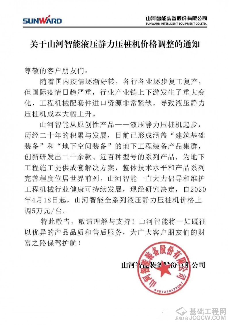 敬告客户:山河智能全系列液压静力压桩机价格上调5万元/台