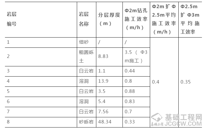岩层钻进:使用截齿捞砂斗或者牙轮筒钻,首先钻进Φ2m桩孔,然后进行扩孔钻进(Φ2m→Φ2.5m→Φ3m)。