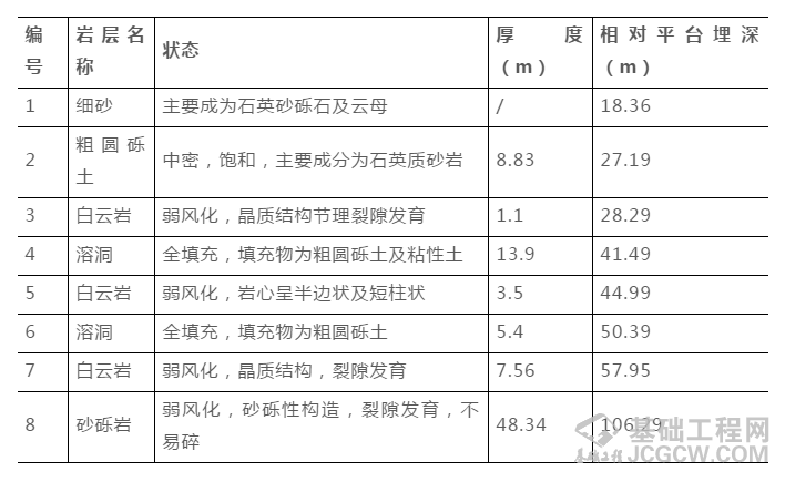 施工区域岩层单轴饱和抗压强度最大达70MPa以上,并且溶洞发育,地层复杂。地层具体分布如下表所示: