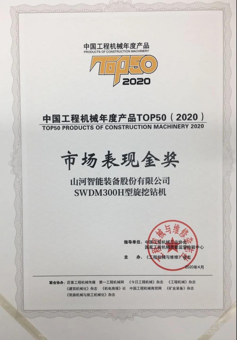 在不久前举办的“2020中国工程机械年度产品TOP50颁奖典礼暨嗨购节”上,山河智能SWDM300H旋挖钻机是唯一获评金奖的旋挖类产品。SWDM300H型旋挖钻机自2018年推向市场以来,就以优良的工况适应性和投资回报率,受到了广大桩基础工程客户的认可,成为桩基施工设备中的现象级产品。据了解,2019年山河智能SWDM300H旋挖钻机在同级别产品中的市场占有率达80%,竞争优势明显,该产品获评TOP50市场表现金奖可谓实至名归。