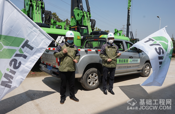 春雷巡检出征仪式现场,由总经理辛鹏、副总经理肖华安向巡检人员授旗,正式开启为期一个月的“春雷巡检”。春雷巡检人员由泰信机械的销售营销人员、研发人员及售后服务人员组成,将在持续一个月的时间里分赴全国各地,了解和记录泰信旋挖的运行情况,对泰信市场已有中小型旋挖钻机进行“体检”,为客户顺利开工保驾护航。