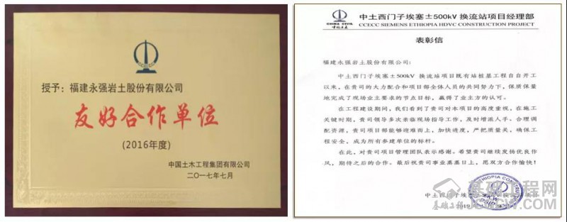 永强岩土与中国土木不断深化合作,陆续在肯尼亚、吉布提、埃塞俄比亚、乌干达等国家以及国内进行项目合作,并被中国土木授予友好合作单位。