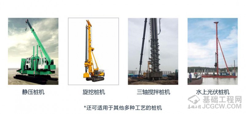 本产品可以适用于多种桩机类型,包括步履式静力液压打桩机、旋挖桩机、三轴搅拌桩机和水上光伏桩机。