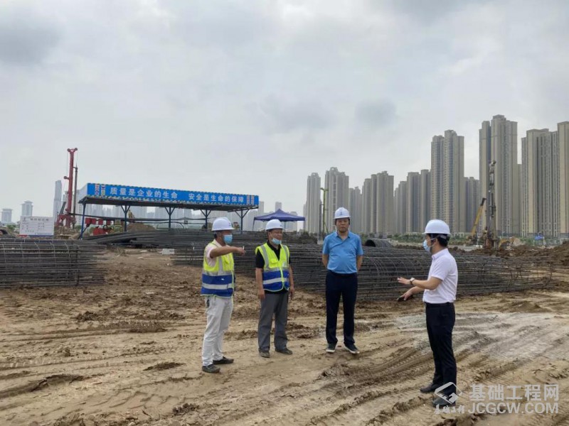 5月30日上午11时,谦诚桩工董事长郭克诚在副总裁兼武汉直属工程指挥部指挥长王涛、技术顾问肖尊群等人的陪同下莅临谦诚桩工在建武汉金茂方岛项目考察指导工作。