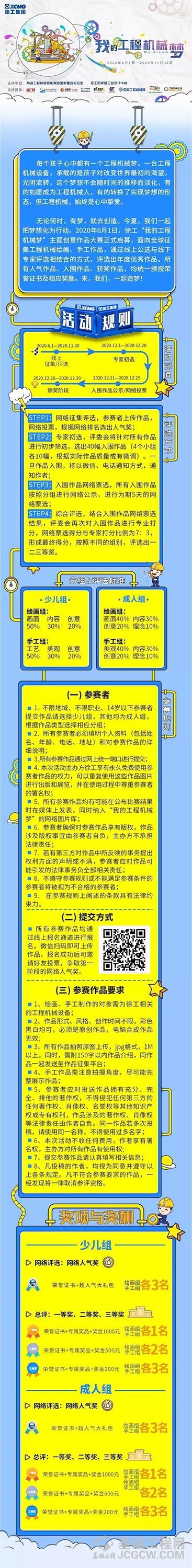 2020年6月1日,徐工“我的工程机械梦”主题创意作品大赛正式启幕,面向全球征集工程机械绘画、手工作品,通过线上公选与线下专家评选相结合的方式,遴选出年度优秀作品。所有人气作品、入围作品、获奖作品,均统一颁授荣誉证书及相应奖励。