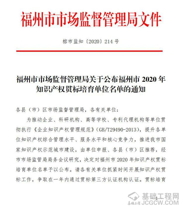 喜讯!建中建设成功入选“福州市2020年知识产权贯标培育单位”