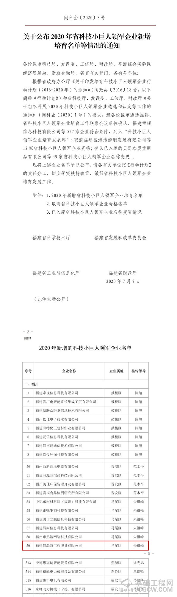 近日,从福建省科学技术厅获悉,建中建设旗下全资子公司福建省晶海工程服务有限公司(以下简称:“晶海工程”)成功入选“2020年省科技小巨人领军企业”培育名单。