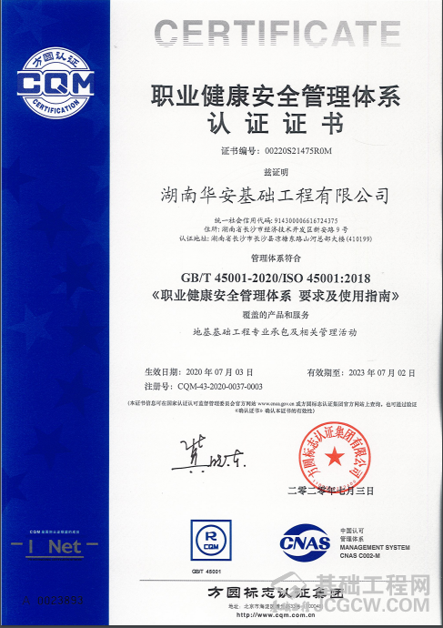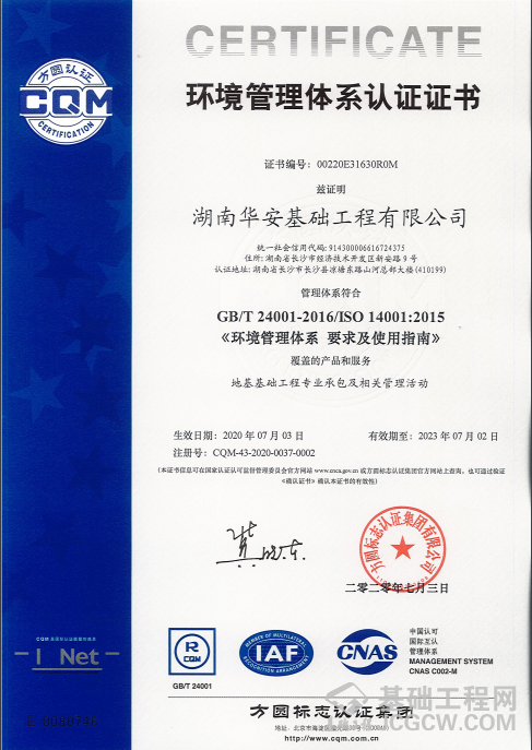 7月14日,山河智能华安基础工程有限公司通过了方圆认证集团湖南有限公司对GB/T 19001-2016/ISO9001:2015《质量管理体系》、GB/T 50430-2017《工程建设施工企业质量管理规范》、GB/T 24001/ISO 14001:2015《环境管理体系》、GB/T 45001-2020/ISO 45001:2018《职业健康安全管理体系》初始认证审核并获得体系认证证书。