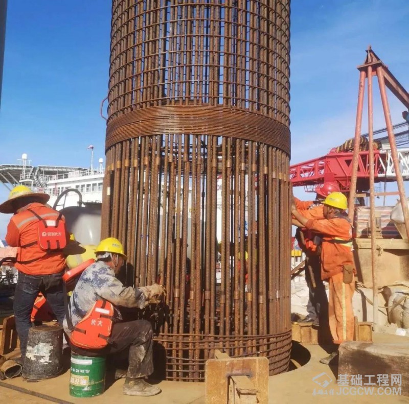 钢筋笼采用分节段加劲筋成型法制作,在陆地制作完成后由货船运送至施工机位。