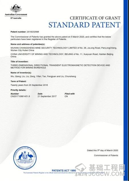 核心提示:2020年3月5日,武汉长盛“一种矿用钻孔三维定向瞬变电磁超前探测装置及方法”技术获得澳大利亚的发明授权;这是武汉长盛煤安科技有限公司2017年获得首件美国发明专利授权以来的又一收获,据悉该项技术还申请了美国等多国发明专利,公司专利布局实现了新的突破。