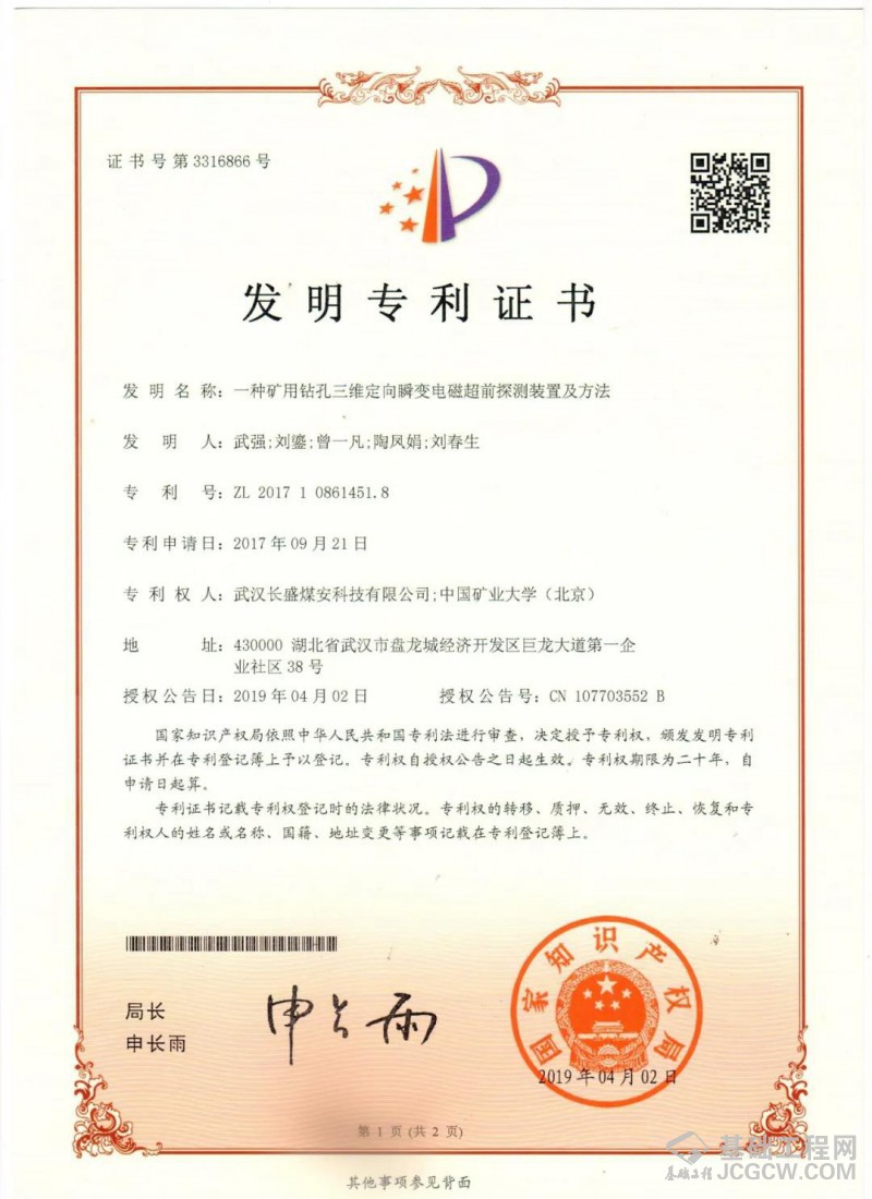 2020年3月5日,武汉长盛“一种矿用钻孔三维定向瞬变电磁超前探测装置及方法”技术获得澳大利亚的发明授权;这是武汉长盛煤安科技有限公司2017年获得首件美国发明专利授权以来的又一收获,据悉该项技术还申请了美国等多国发明专利,公司专利布局实现了新的突破。