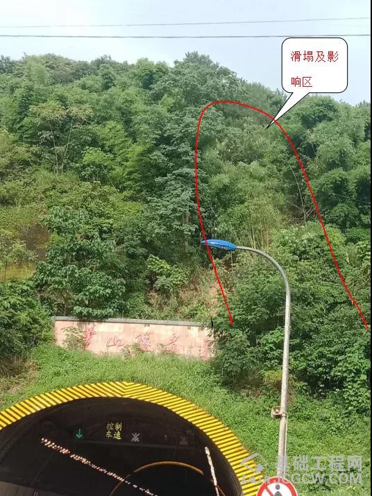 7月20日夜晚,由于重庆持续降雨,大量雨水下渗,致使土壤水分饱和并软化后,斜坡土体在重力和孔隙水压力作用下,沪渝高速华山隧道往沪方向入口上部斜坡发生滑塌险情,滑塌体位于公路外侧,滑塌体纵长约35米,横宽约15~24米,后缘下错,已向下滑移至隧道口顶部洞名标志墙处。如不及时加固,将严重威胁高速交通运输安全及人民群众生命财产安全。
