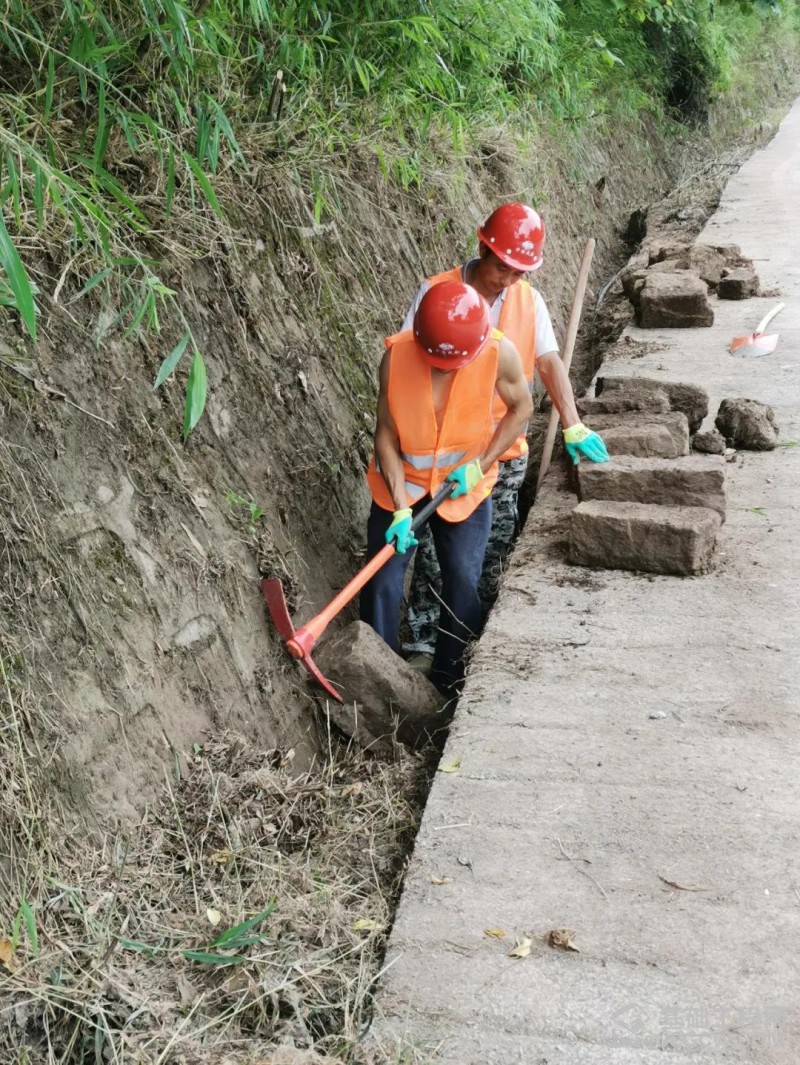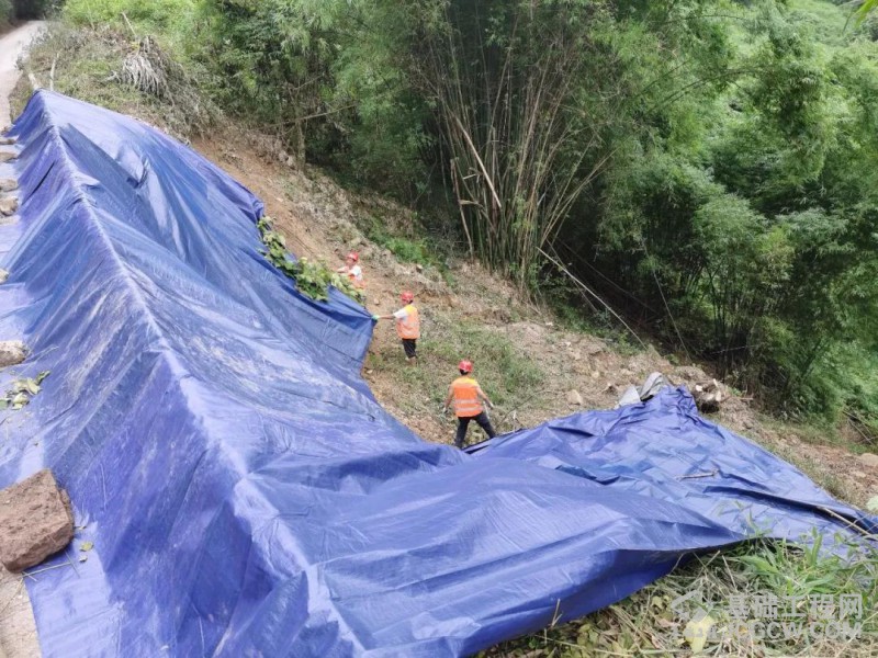 当前,抢险工作正在紧张的气氛中有序进行。抢险应急队员们脚踩泥泞的道路,浑身挥汗如雨,对滑塌体表层的石块及树木进行细致清理,疏通滑坡体后侧公路长约60米的水沟,同时在现有公路外侧修筑5厘米高的混凝土挡块,防止地表水从公路内侧溢出到滑体后侧,利用防水布将现有滑塌体及其临近一定的区域进行遮盖,防止雨水进入滑塌体,诱发二次滑塌。所有抢险队员不怕苦、不怕累,目标只有一个:确保高速公路的安全!抢险队员纷纷表示,作为央企一员,就必须表现出高度的勇气与担当!
