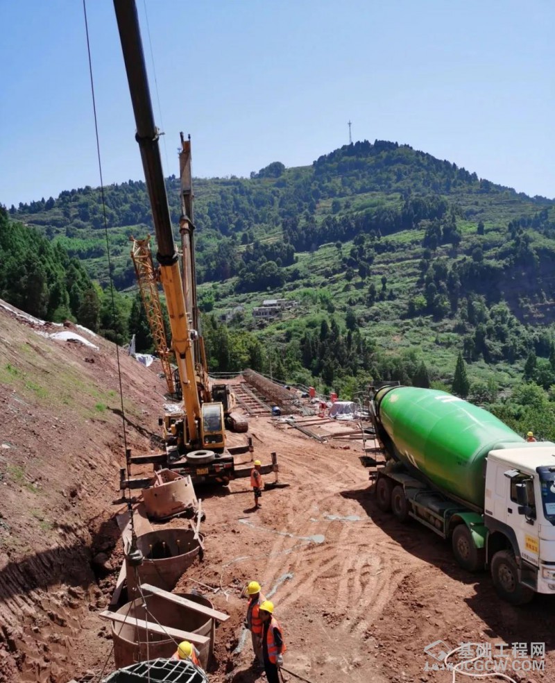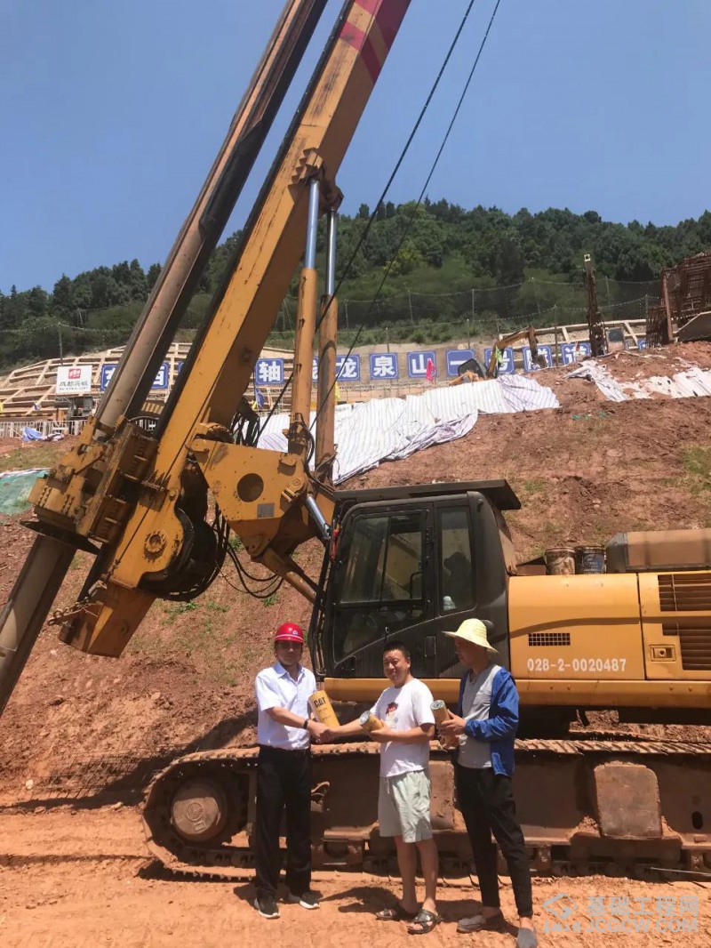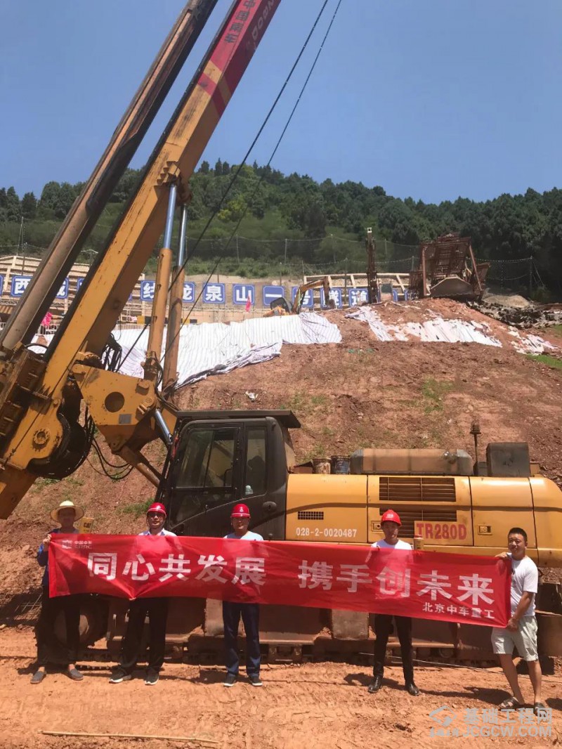随后,服务小组驱车前往成都建工东西城市轴线龙泉山一号隧道桥梁工程施工工地,看到服务小组和“同心共发展,携手创未来”的标语,客户紧忙迎上前来,这个工地有一台TR280D旋挖钻机正在施工。服务小组到访后就与操作手攀谈起来。“北京中车重工的旋挖钻机顶呱呱!有了你们的旋挖钻机,我们操作手就能挣很多钱。”操作手朴素的话语间透着对北京中车重工的肯定,每天他们都要从早晨6点工作到晚上10点。据两位客户的操作手介绍,这台旋挖每天可打4根桩,每根桩一般为1.2米桩径,32米深。