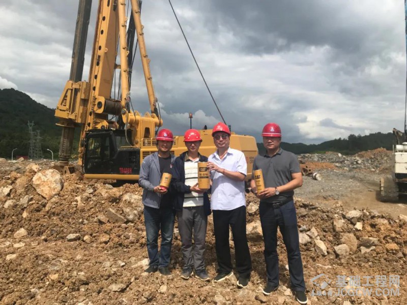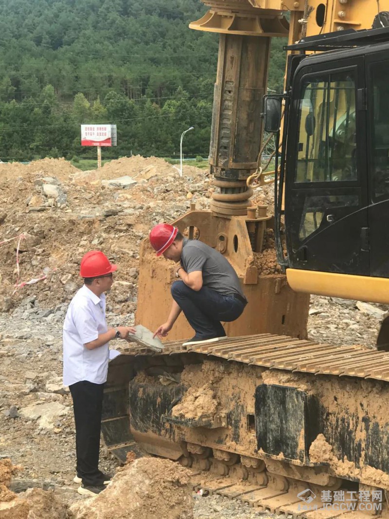 紧接着服务小分队走进下一施工现场——贵阳龙里融创别墅项目。印入眼帘的是北京中车重工TR408H旋挖钻机高大的身影,在忙碌着,仰天而望,醒目的颜色在天空下显得格外耀眼。服务小分队从施工场地了解到现场地质比较复杂,岩层硬度45MPa,桩径2.5米,深度30米,除此之外,项目组要求设备24小时施工,这对施工设备是一项很大的挑战。施工方在综合考虑了施工设备质量、性能、效率、服务等多重因素后,选择北京中车重工TR408H旋挖钻机进场。以每天施工深度达26-30米不等的施工效率,提高了成孔效率及质量,完美保证工期。