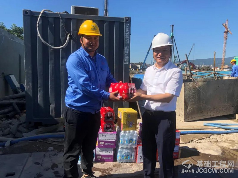 8月15日上午,中淳高科董事长邱风雷、中淳桩基常务副总杨帆一行来到宁波海曙区静钻根植桩项目现场看望在高温下坚守一线的工程建设者,为他们送去了防暑降温慰问品。邱风雷董事长认真了解了施工人员高温期间的工作及生活状况,对他们冒着烈日酷暑、坚守岗位、忠于职守的精神表示高度赞扬,叮嘱他们一定要穿好防护服、戴好安全帽、保重身体、确保安全,并对工程质量管控和安全文明施工提出高标准、严要求。