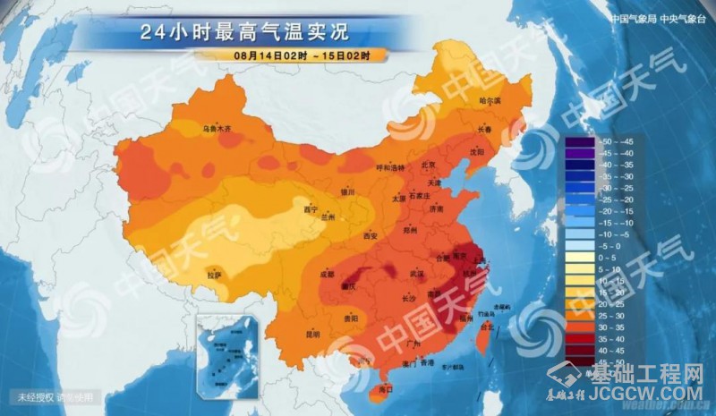 8月14-15日 中国最高气温分布图(来源:中国天气网)