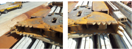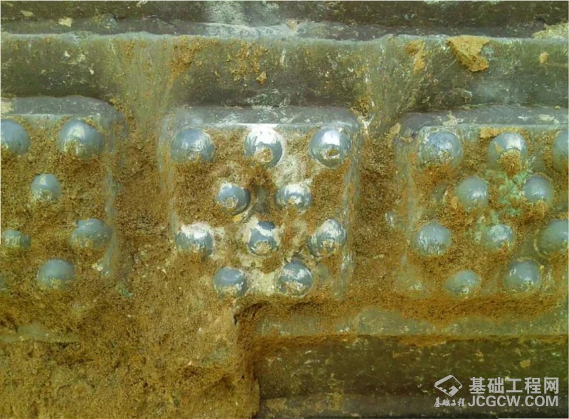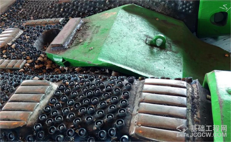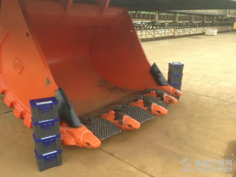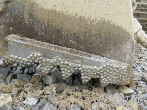 很明显地看到,在耐磨钉之间充填了泥土和砂石,从而产生了“石盒效应”,耐磨钉和充填物很好的结合在一起,整体的对抗外力磨损。也就是说,通过耐磨钉以及它们中间的充填物,挖斗的表面得到了很好的保护。