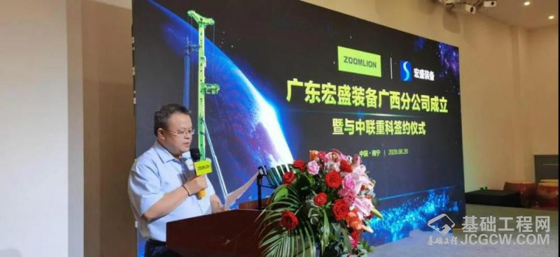 上海中联重科桩工机械有限公司营销公司副总经理龙显峰在随后的致辞环节代表中联重科祝贺广东宏盛工程装备有限公司广西分公司的成立,并表示,广东宏盛工程装备有限公司是中联重科一直以来都高度重视与关注的合作伙伴,更是中联重科最重要的联盟客户之一,双方已在基础施工机械领域开展了多次的深度合作,本次的批量采购签约,再次体现了双方互信互利、合作共赢的良好合作关系。