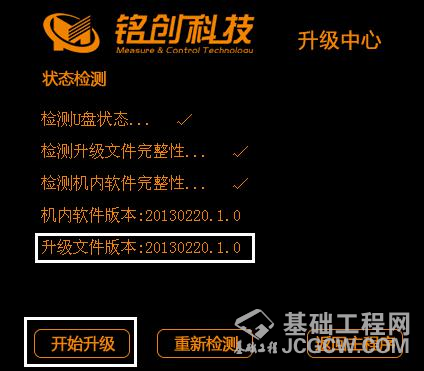 5、 仪器自动识别升级程序,进入升级程序,请仔细对照要升级的版本信息,然后点击开始升级按钮,如图 5 所示,仪器自动进行升级,升级之后仪器自动重启并进入主界面,在主界面上查看升级后的软件版本确认是否升级成功。图5升级主程序
