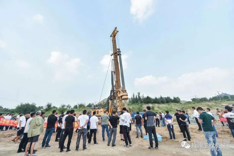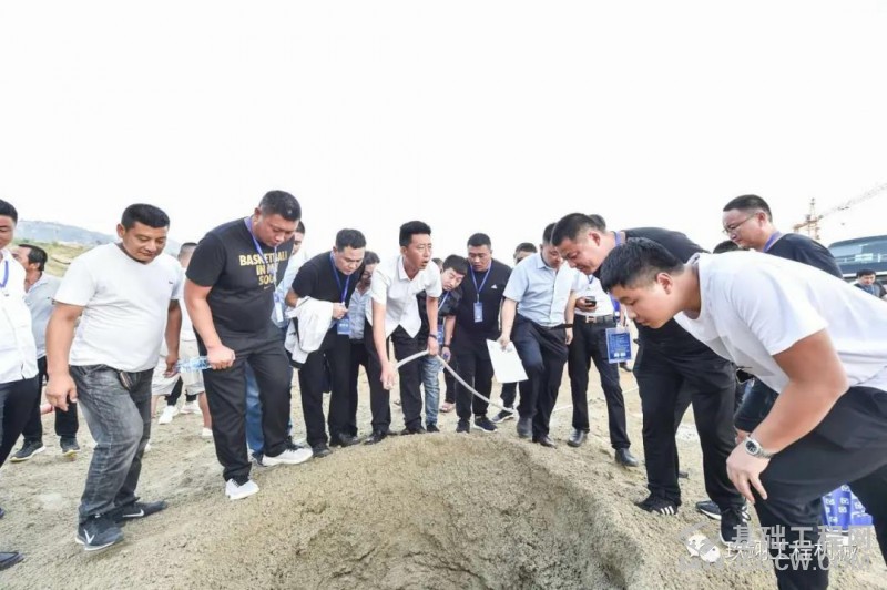 荣峰酒店用餐结束后到现场参观1.25米集束式潜孔锤作业,玖翊潜孔锤专业操作手进行演示,现场的观众纷纷拿起手机记录下这重要的一刻,伴随着潜孔锤有力的敲击声,桩孔快速形成,现场观众一片称赞声。