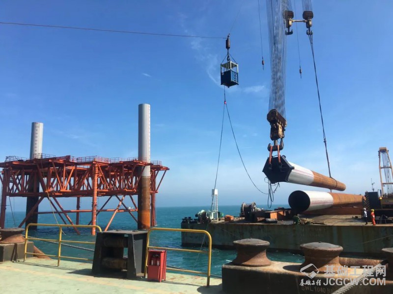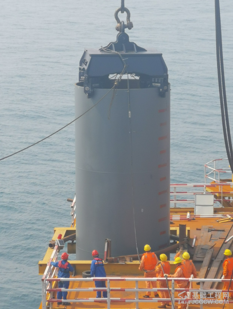 在海上施工现场,项目部成功使用永安机械翻桩器把钢管桩吊装入水,并配合永安机械的液压冲击锤YC-120继续打桩施工。