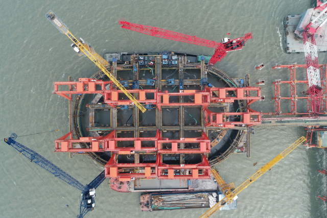 据介绍,6号墩钢沉井为新型减自重减冲刷台阶式沉井,平面长95米、宽57.8米,高64米。钢沉井为井壁填充混凝土的钢壳结构,总重超22万吨,能承担起主跨超千米的桥梁全部荷载。