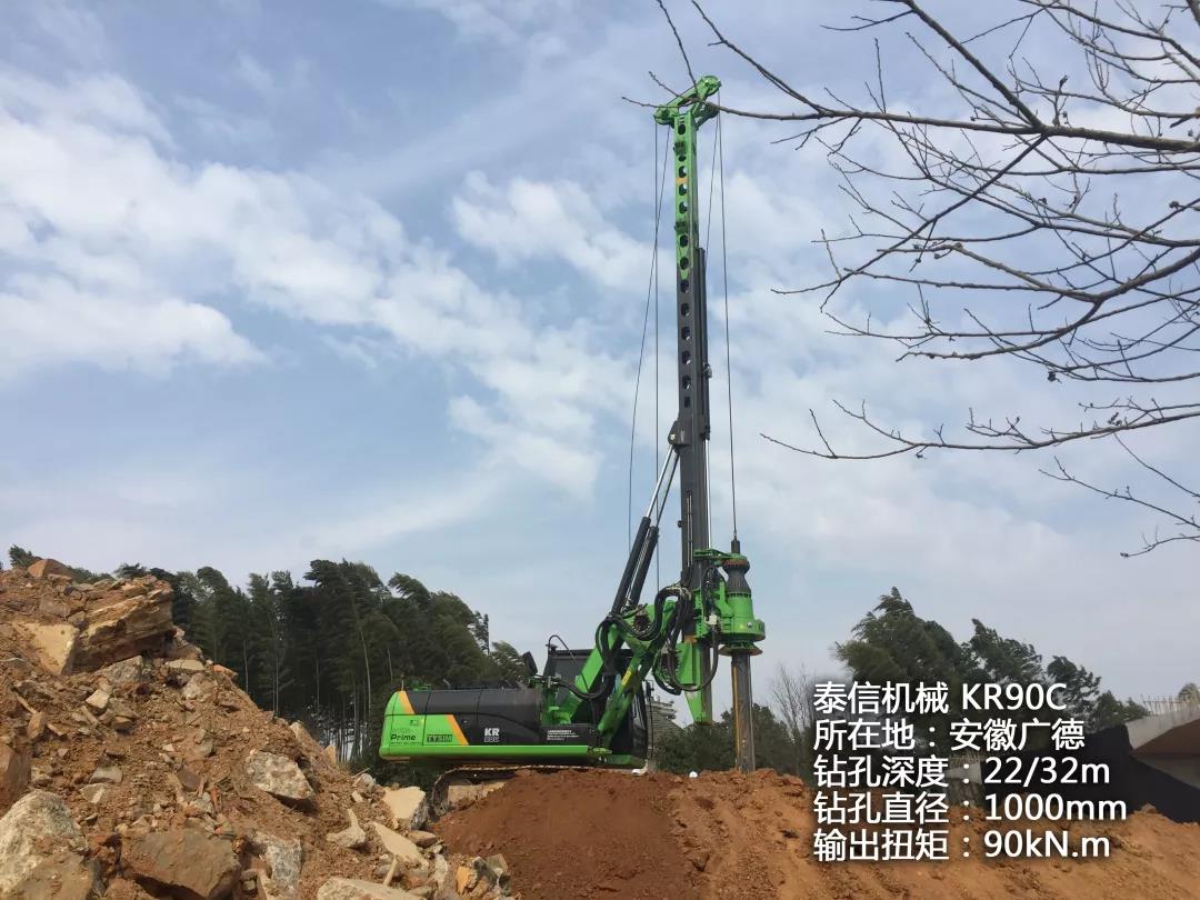 泰信机械KR90C旋挖钻机,发动机功率88kw,钻孔直径400~1200mm,深度最深达到28m,整车采用轻量化设计,装备重量27t,在同等安全系数条件下钻杆的提升和下放速度可以达到最大75m/min,钻机回转速度可以达到5r/min,动力头转速快至8-30r/min,采用卡特彼勒定制底盘。作为泰信卡特系列旋挖钻机底盘的高端品牌供应商,卡特彼勒公司对与泰信机械的创新合作模式表示高度赞同,同时表示将持续与泰信保持良好的合作伙伴关系,为泰信卡特系列旋挖机在全球范围内的市场做好“保姆式”售后保障服务工作。