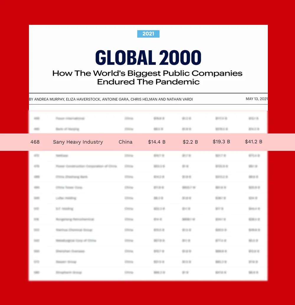 5月13日晚,《福布斯》发布2021年全球企业2000强,其中,三一重工排名总榜单第468位,首次跻身全球企业500强,排名较去年大幅上升235位,是榜单中排名中国第一、全球第二的工程机械企业,也是中国工程机械行业第一家《福布斯》全球500强。