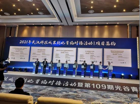 2021年5月16日上午,2021年武汉科技成果转化首场对接会在光谷科技会展中心举行。现场45个科技成果转化项目成功签约。本次活动由武汉市人民政府举办,东湖高新区管委会和武汉市科学技术局承办,武汉市相关部门领导,以及在汉有关高校领导,相关签约项目及创投机构代表300多人出席了对接会。