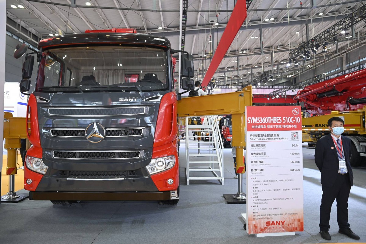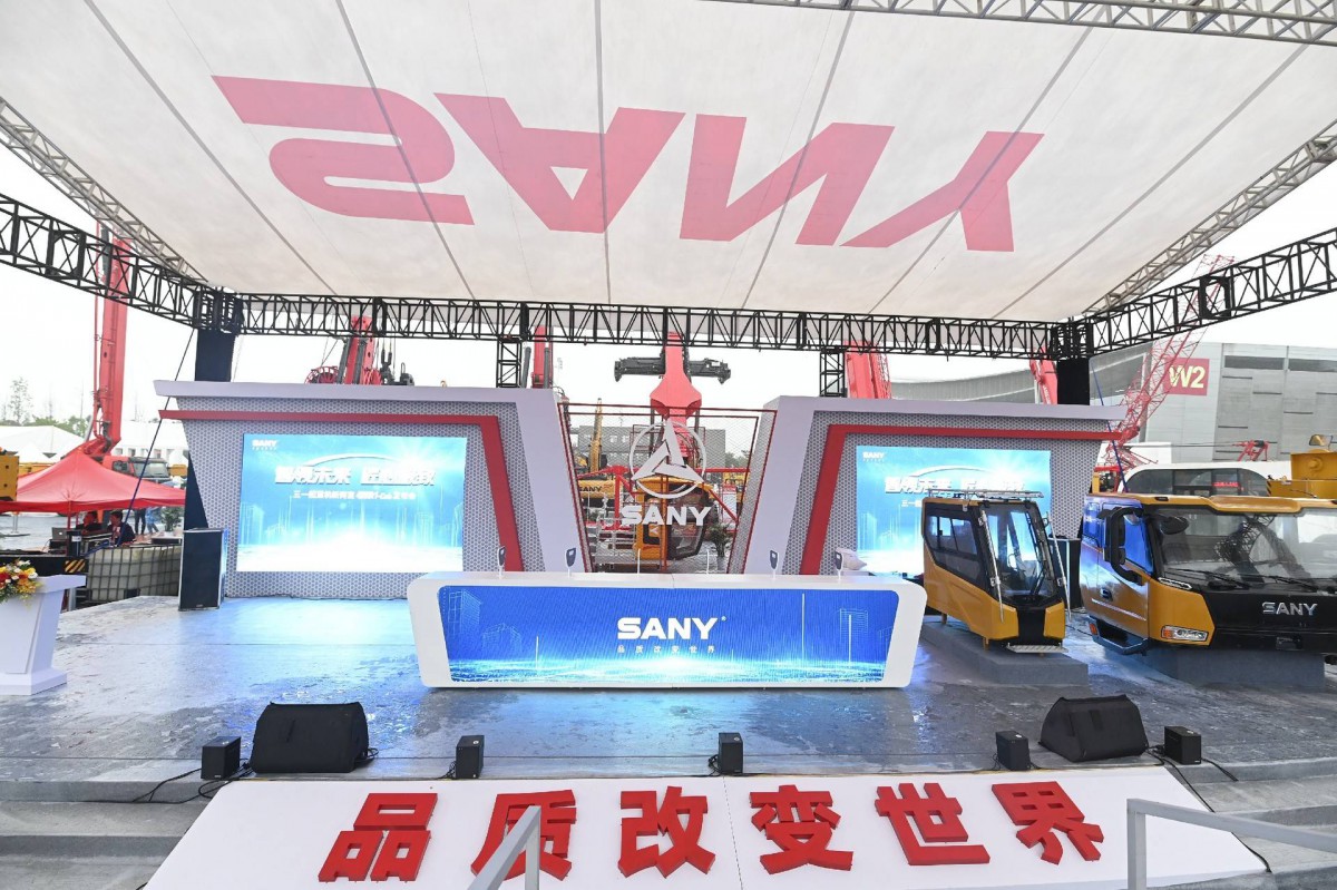 主舞台旁,“世界泵王”家族的首款柴电混动产品——SY5153THBE柴电双动力车载泵,可柴可电,一车两用,助力客户轻松应对250米以内的高层泵送。