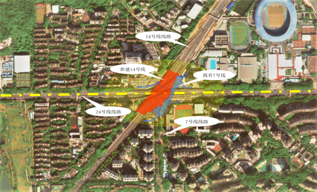黄木岗综合交通枢纽坐落于笋岗西路、泥岗西路、华富路、华强北路五叉路口,北至体育中心西门、南至海馨苑、西至中心公园、东至体育中心南门。为既有7号线、新建14号线以及规划24号线三线换乘枢纽。14号线沿华富路和泥岗西路地下敷设,为地下三层叠侧车站,与既有7号线同台换乘;规划24号线沿笋岗西路地下敷设,为地下四层车站,与7、14号线形成节点换乘。
