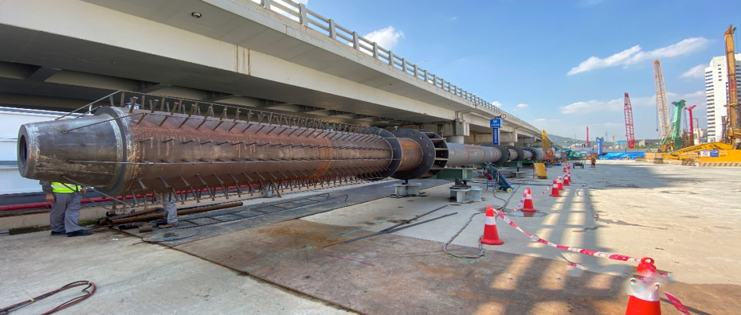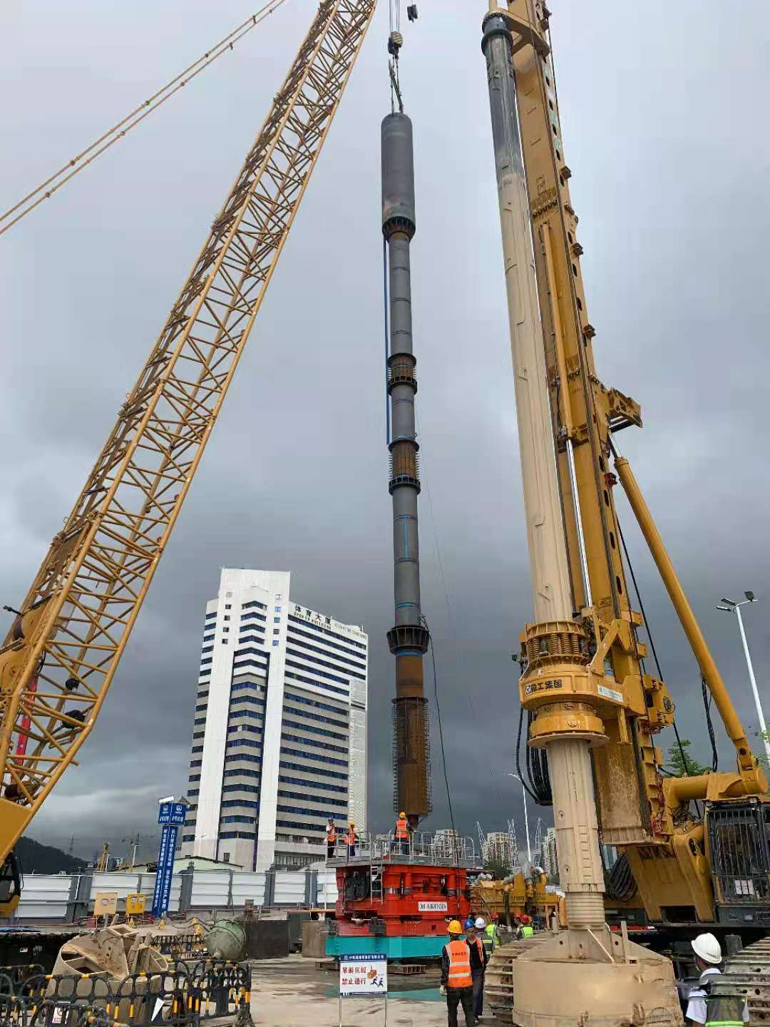 本项目中间桩柱由开普天五广(上海)基础工程有限公司承建,本工程属于重难点控制性项目,主要难点;钢管柱直径达到1600mm,起吊最大重量120t,长度为40m,由此,吊装方案是重中之重。成孔难度大;桩径最大3m、入强风化花岗岩、中风化花岗岩、弱风化花岗岩、微风化花岗岩,岩样最高强度达到120MPa。