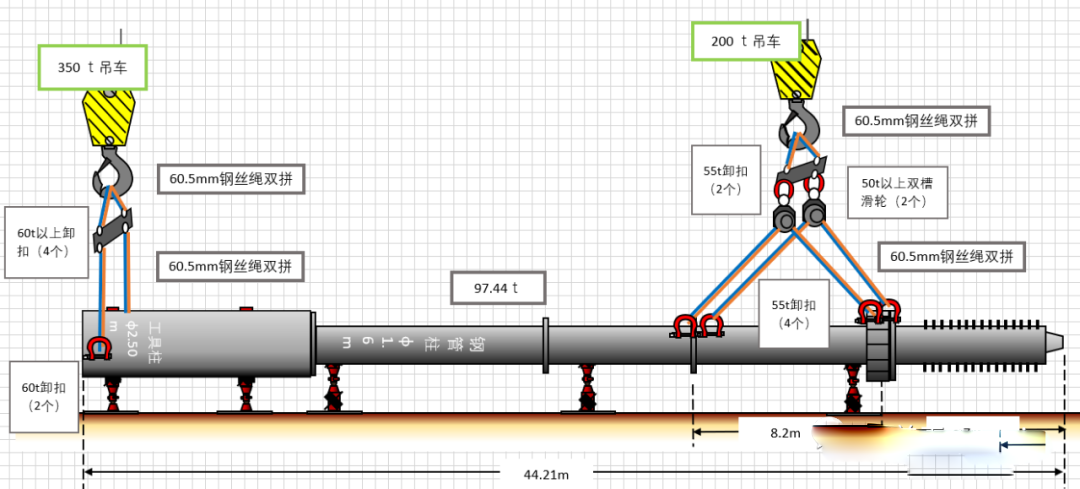 兵马未动,粮草先行。施工第一步便是要有方案,针对这种重难点控制性工程我司以技术方案为主导,在开工前筹备阶段,开普天领导和技术部门开展了探讨和研究,制定了技术吊装方案,吊装分为双机抬吊转体竖立、吊装行走、孔口竖向下放三种工况,为满足吊装条件主吊采用350t履带式起重机,副吊采用200t履带式起重机,保证了在起吊至下放过程中不会出现超重负荷情况。