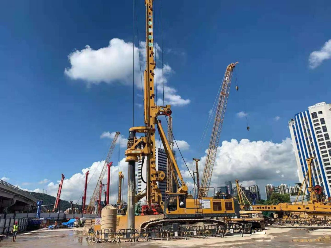 深圳黄木岗站是主要的枢纽中心,因此施工时间也要争分夺秒抢工期,针对成桩直径最大达到了3m,和入岩至微风化高达120MPa,开普天经过讨论和核算同样也采用了大功率旋挖钻机徐工550旋挖,保证成桩质量及施工速度要求。