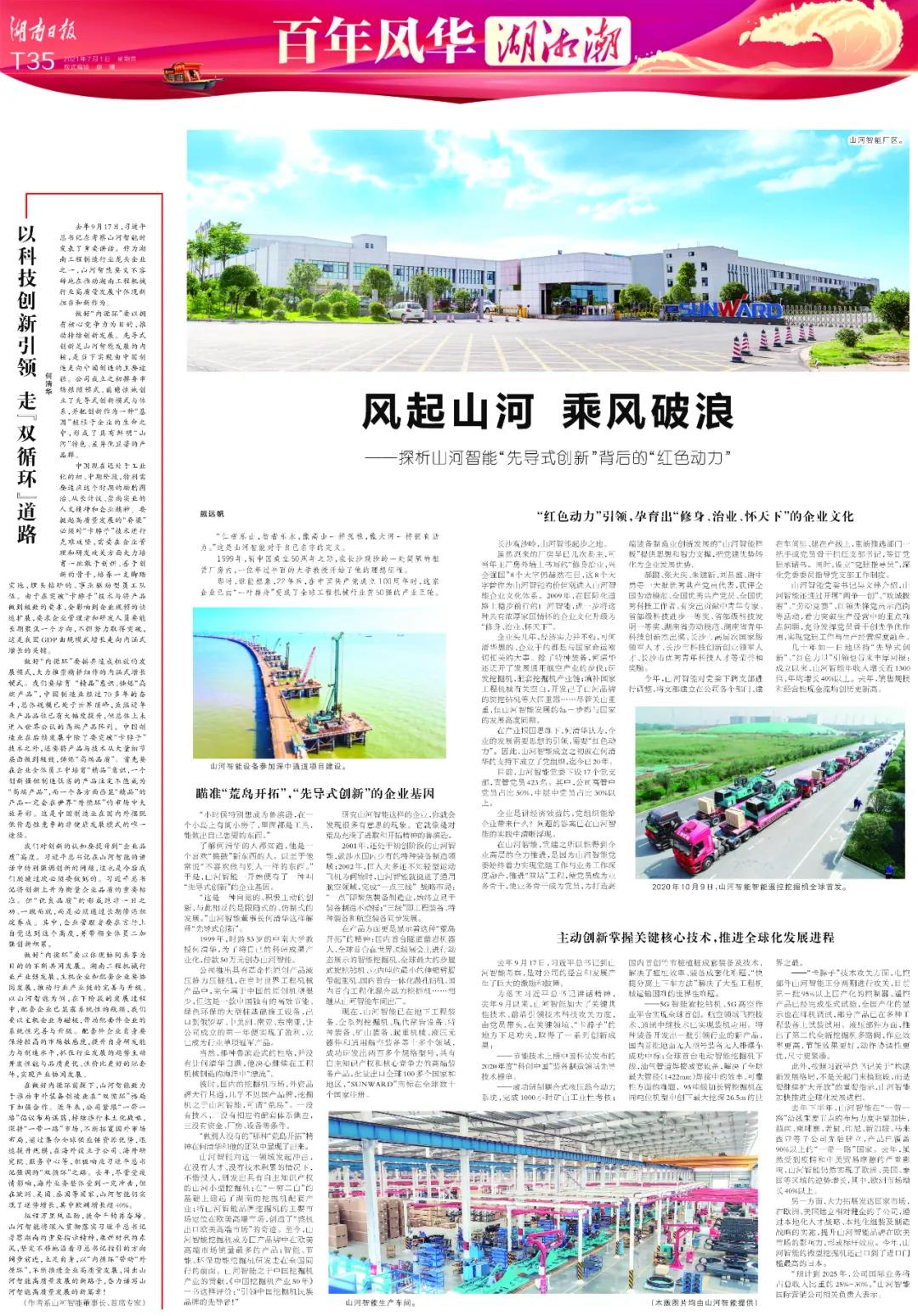 2021年7月1日,湖南日报推出《百年风华湖湘潮》百版特别报道,献礼党的百年华诞。特刊第35版发表山河智能董事长、首席专家何清华教授署名文章《以科技创新引领,走“双循环”道路》,并以《风起山河,乘风破浪》报道山河智能。