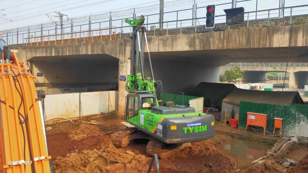 在江苏省南京市,泰信机械KR125ES低净空旋挖钻机参与了江苏南沿江城际铁路南京南站路段项目。本项目的施工工地紧挨着高速铁路,要求不能影响正在运营的高速列车,同时要求旋挖钻机钻孔过程中不能有地基沉降,施工难度大。泰信机械低净空旋挖钻机KR125ES以其施工高度不超过8米的优势,优异施工工艺工法(调配合适泥浆比例)保证了安全施工及施工效率。