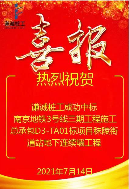 7月14日,谦诚桩工收到中铁一局集团城市轨道交通工程有限公司发出的中标通知书:谦诚桩工在多家投标单位中综合评分第一名,顺利中标南京地铁3号线三期工程施工总承包D3-TA01标项目秣陵街道站地下连续墙工程。