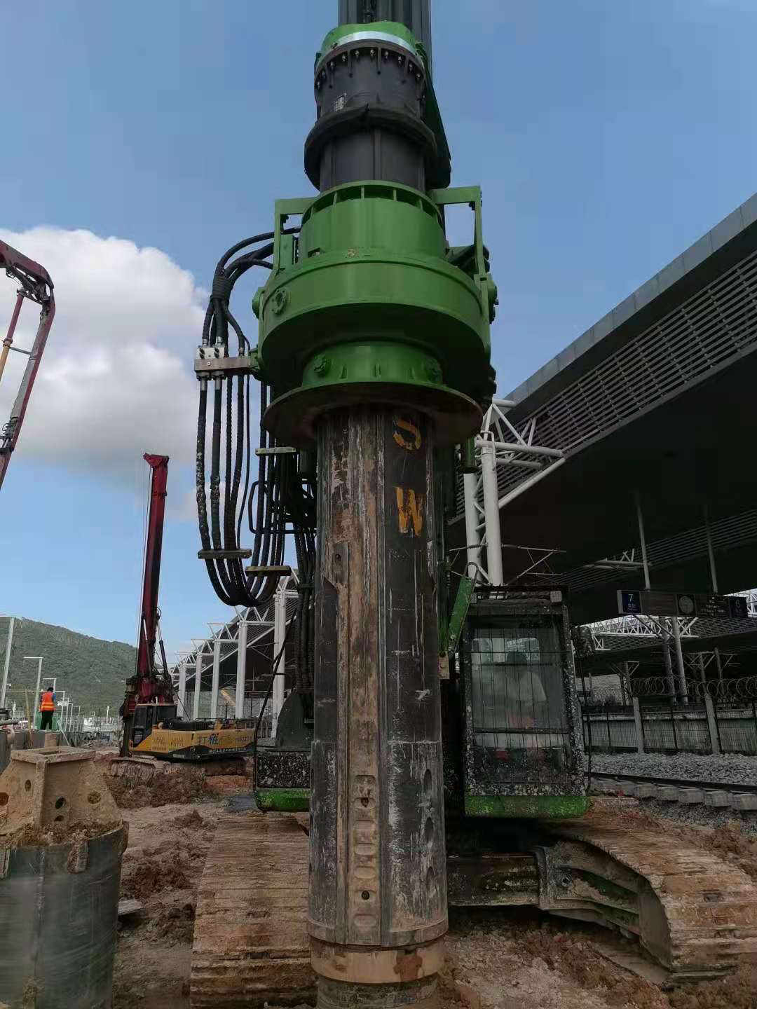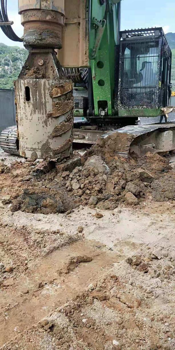 该项目属于泉州高铁站扩建项目,毗邻正在运营的高铁站,每天来往高铁车辆比较多,现有施工不能对高铁运营产生影响。同时施工要求高度不能超过11米,桩径1米。该地层为回填塘渣,回填地层比较复杂,有较大回填石块,粒径20-200mm不等,个别存在较大石块,并且回填深度在0-8米不等,属于易塌孔地层,同时不能对周边地层形成扰动,以免影响高铁运营,需要设备较强动力及入岩能力,施工难度极大。泰恒KR285CS工作状态高度仅11米,最大施工直径2米,深度最深达到35米,解决工程施工中遇到的空间小、桩径大、深度深、扭矩大能入岩等难题,能够在兼顾低的施工高度和超深的施工深度条件下,完成大口径入岩施工。