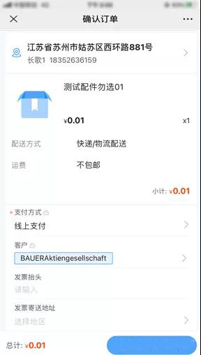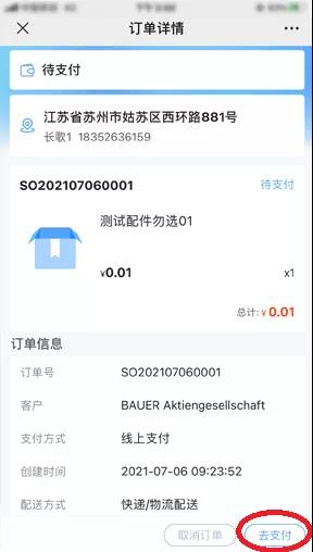 在订单详情页面,确认信息无误后,点击“去支付”,完成订单款的支付。