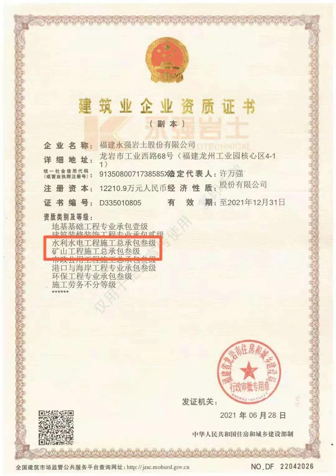 近日,永强岩土顺利获批水利水电工程施工总承包三级和矿山工程施工总承包三级两项资质。