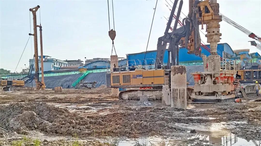 在打桩施工时,徐工旋挖钻机充分发挥了大扭矩、强动力的优势,配合全跟进护筒进行全回转施工,虽然护筒重量达21吨,但下管、拔管都极其顺畅,施工效率和质量都是“666”。