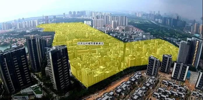 位于深圳市南山区东部的沙河街道,作为深圳最大的城中村之一,拥有几乎深圳市区最集中最大规模的农民房,沙河五村城市更新项目(即白石洲旧改)更新单元用地面积约48.01万㎡,拆除用地面积约45.95万㎡,开发建面约30.38万㎡,改造后计容积率总建面高达347.96万㎡。