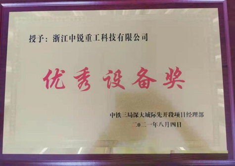 8月5日,鉴于中锐重工科技有限公司ZG70液压抓斗在深圳机场至大亚湾城际深圳机场至坪山段工程先开段项目的出色表现。中铁三局授予浙江中锐重工科技有限公司“优秀设备奖”荣誉称号。