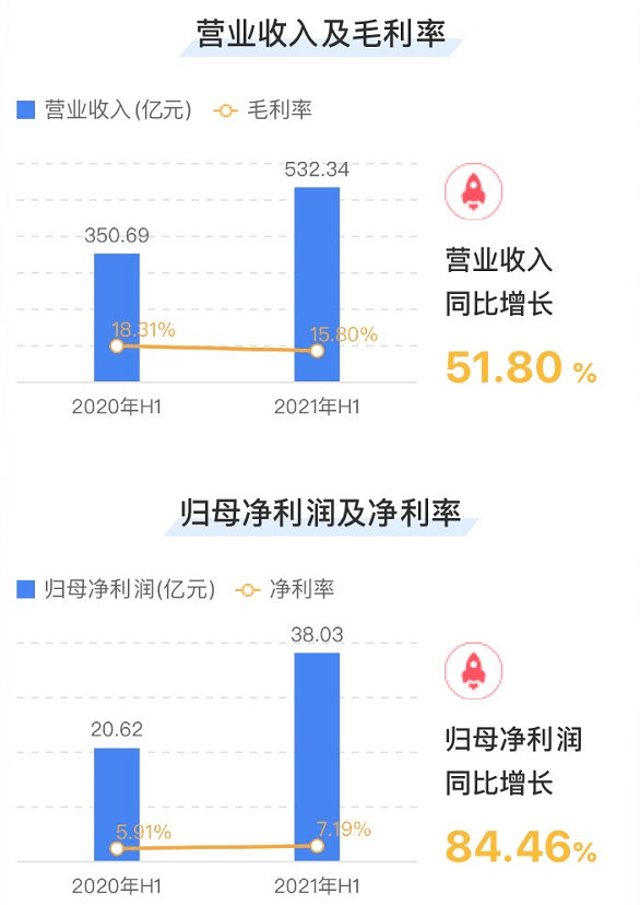 作为国家技术创新示范企业,公司坚持自主创新,不断加码研发投入力度。2021年上半年, 公司研发费用投入22.18亿元,同比增长64.43%,研发投入占营业收入比例为4.17%。