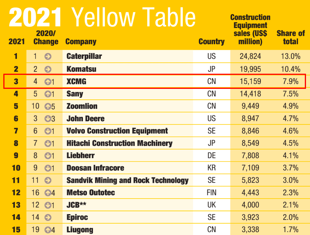 今年上半年,徐工机械继续推进高质量、高效率、高效益、可持续的“三高一可”高质量发展理念,产量、销量、营业收入、净利润等主要指标再创历史新高。英国KHL5月发布的“2021年全球工程机械制造商50强”榜单,徐工首次进入全球前三,连续32年稳居中国工程机械第一位。